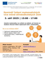 Katedra matematiky a Centrum podpory přírodovědného vzdělávání Přírodovědecké fakulty UJEP zvou všechny pedagogy, učitele, ale i studenty středních a vysokých škol na “Seminář řešení matematických více méně středoškolských úloh”.